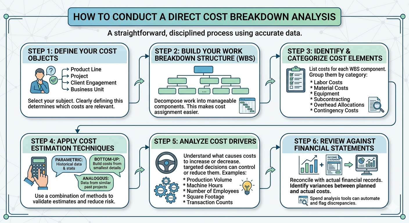 When you conduct a direct cost breakdown analysis, you are examining specific cost elements that contribute to your output. Here is what that typically includes.