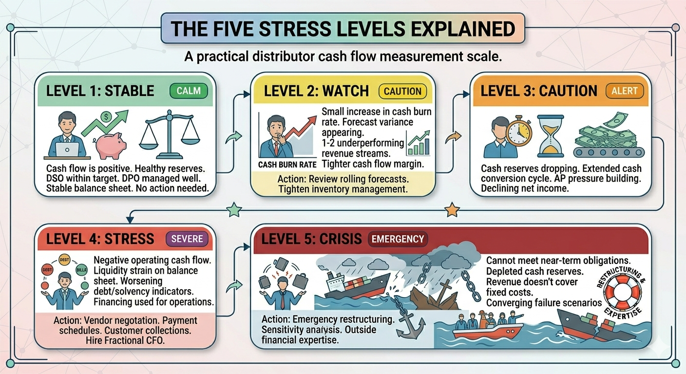 A practical distributor cash flow stress measurement scale uses five levels. Each level reflects a different state of financial health and requires a different response.