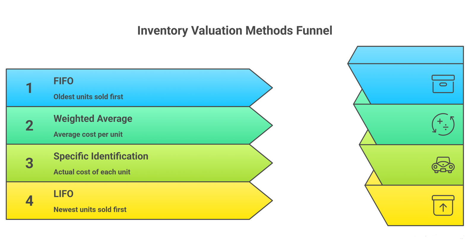 The specific identification method tracks the actual cost of each individual unit. Car manufacturers and dealers use this because each vehicle has a unique cost and identifier. It is precise but requires detailed purchase records for every item.