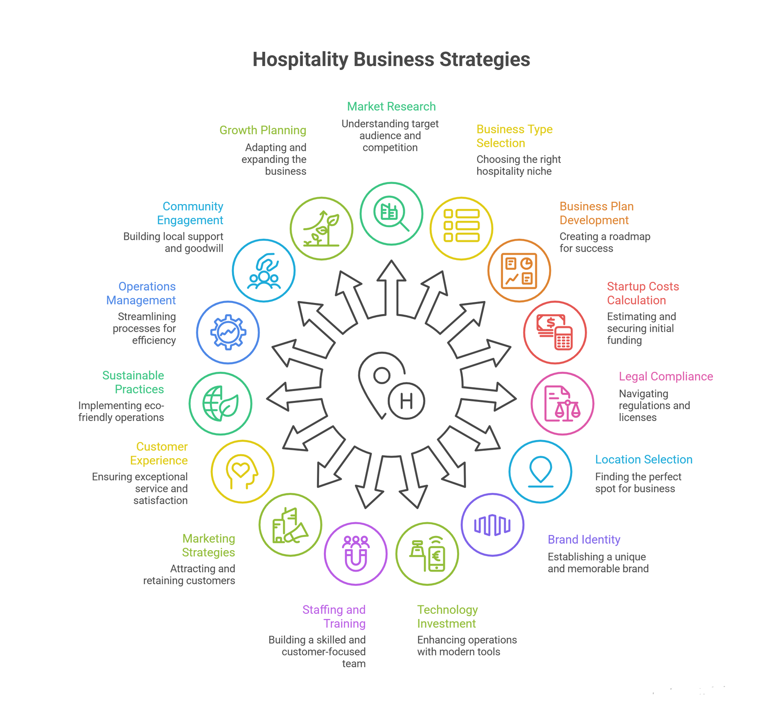 Starting a hospitality business requires careful planning, adequate capital, industry knowledge, and unwavering commitment to customer service. Success factors include thorough market research validating your concept, comprehensive business planning guiding your journey, adequate funding ensuring financial stability, prime location selection matching your target market, strong brand identity differentiating your business, technology integration optimizing operations, exceptional customer service creating memorable guest experiences, sustainable practices attracting conscious consumers and reducing costs, effective marketing generating awareness and bookings, and continuous adaptation to industry changes and customer preferences.