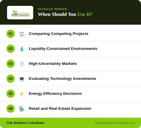 Liquidity-constrained environments: When cash flow management is critical and a business cannot afford to have capital tied up for long periods, the payback period ensures investments contribute to liquidity within a defined timeframe.
