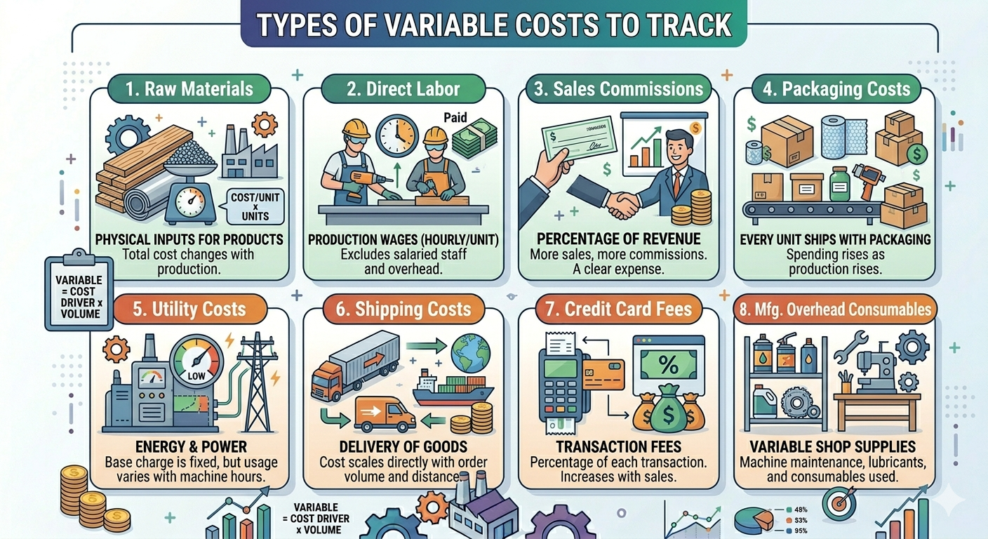 Variable costs do change with production volume. Raw materials, direct labor on a per-unit basis, packaging and shipping, and sales commissions all fall here.