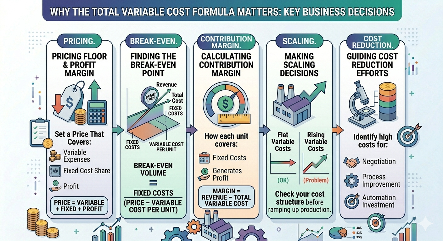 Cost reduction efforts. When you break total variable cost into its parts, you can see where the largest costs sit. That is where you focus negotiation with suppliers, process improvement, or automation investment. Effective cost management at this level is what separates lean operators from those constantly under margin pressure.