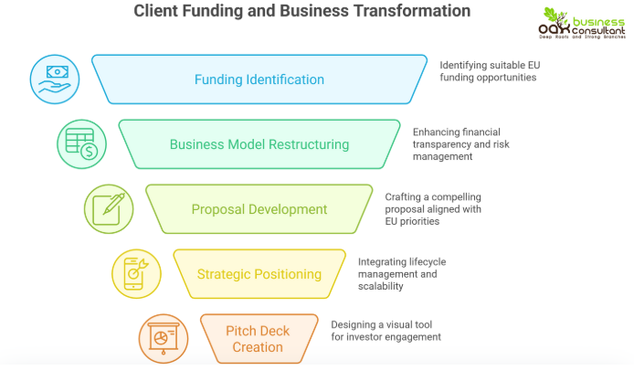 Oak delivered end-to-end business funding advisory services. This included identifying financing options such as EU grants and blended finance, guiding the application process, and structuring the business model to attract both public agencies and private investors.