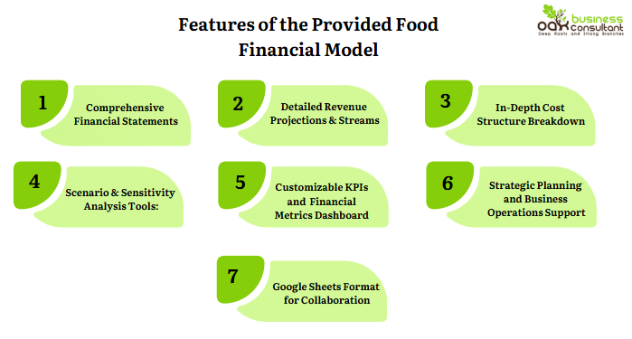 Oak Business Consultant delivered a comprehensive, highly adaptable food financial model, fully compatible with Google Sheets, and designed for the Saudi food and beverage industry. The model offers: