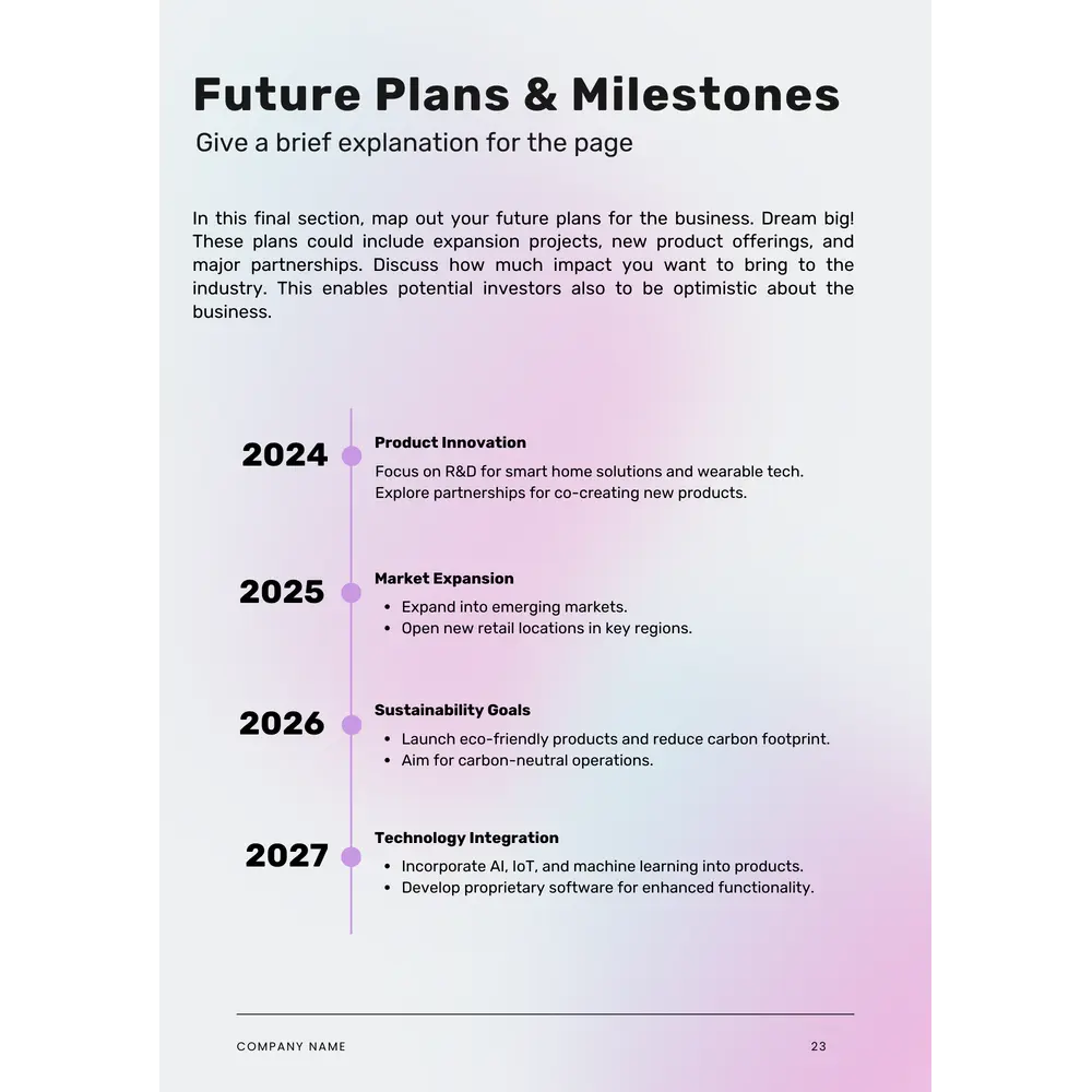 Creating an electronics business plan requires meticulous attention to detail and a thorough understanding of the industry. This template simplifies the process by offering structured sections for market analysis, financial planning, and operational strategies. By customizing the template to reflect your unique business idea and leveraging its features, you can confidently present a comprehensive plan to stakeholders and potential investors. Use this guide as a roadmap to navigate the competitive electronics market and achieve your entrepreneurial goals.