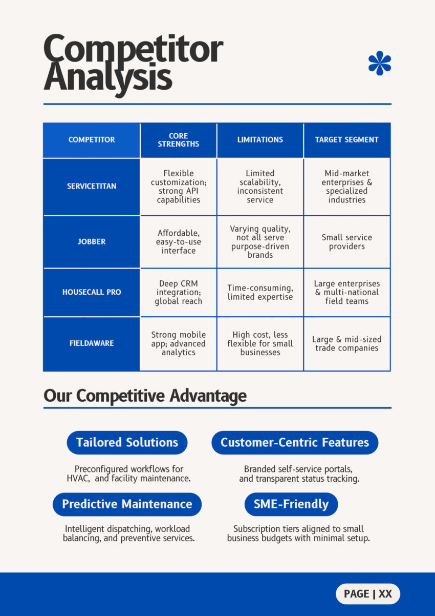 - Competitor Analysis: Benchmarks against existing players while outlining the competitive advantage and Value Proposition.