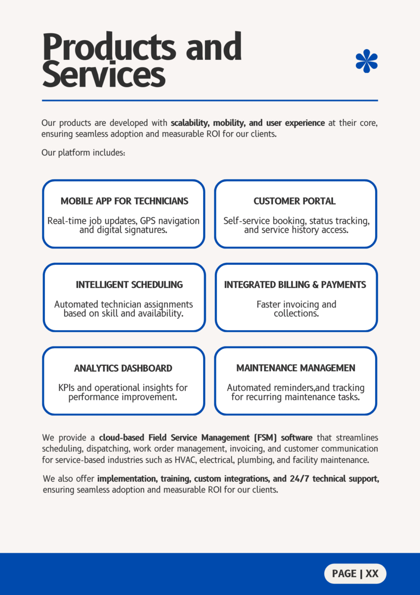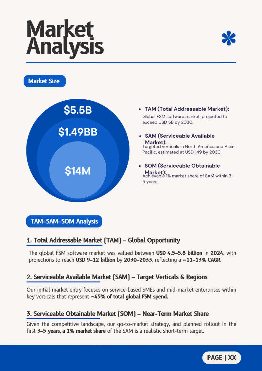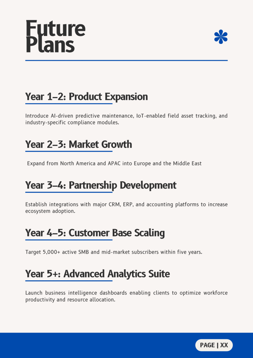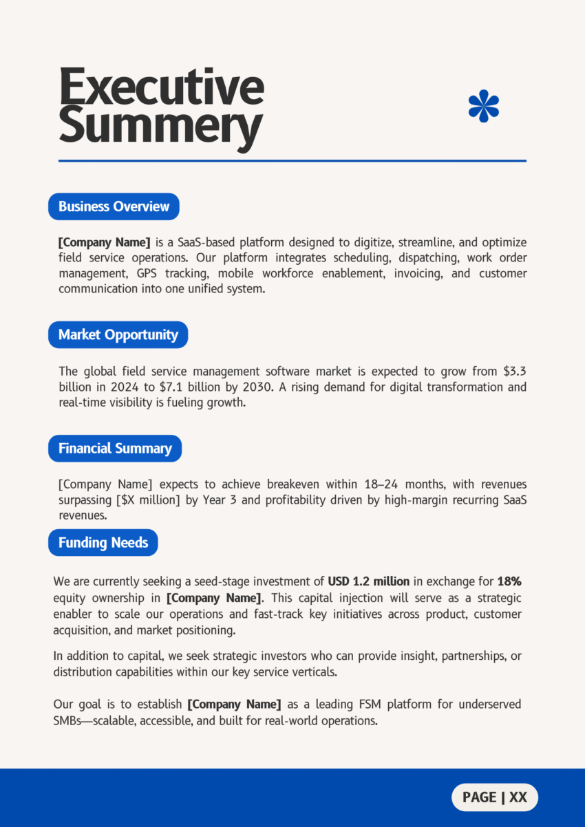 This business plan template provides a structured roadmap for launching and scaling a Field Service Management software company. It highlights product or service offerings, market demand, customer segments, and financial projections needed for an investor-ready startup business plan.